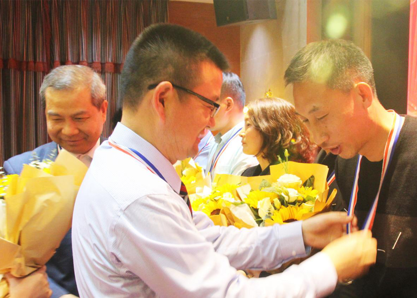 信遠(yuǎn)科技董事長(左前一)在20周年司慶盛典上為李玉田授功勛牌