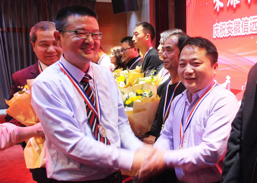 信遠科技董事長(左)在20周年司慶盛典上向鄒長林授功勛牌并握手合影