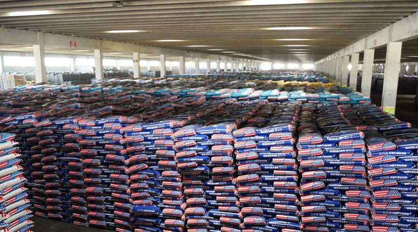 這套生產(chǎn)線設備是原料經(jīng)過人工投料后,配混設備會把不同配方的物料元素按照不同的配置比例進行自動配料和自動混合?;旌暇鶆蚝蟮脑陷斔椭涟b機上方的儲料倉斗內(nèi),倉斗內(nèi)的物料通過快慢兩級螺旋給料的方式充填進包裝袋中,包裝過程為全自動化作業(yè),無需人工參與,即可完成自動上袋、夾袋和充填物料,待稱重傳感器檢測到袋內(nèi)物料重量達到設定數(shù)值時,自動停止充填、并自動松袋落袋,落在輸送帶上的包裝袋將會自動運送至自動折邊縫包機前進行縫包成品。成品袋在輸送過程中,自動完成倒包、振實、壓平等理包整形后,由機器人完成碼垛入庫,日產(chǎn)量可以達到100噸左右。