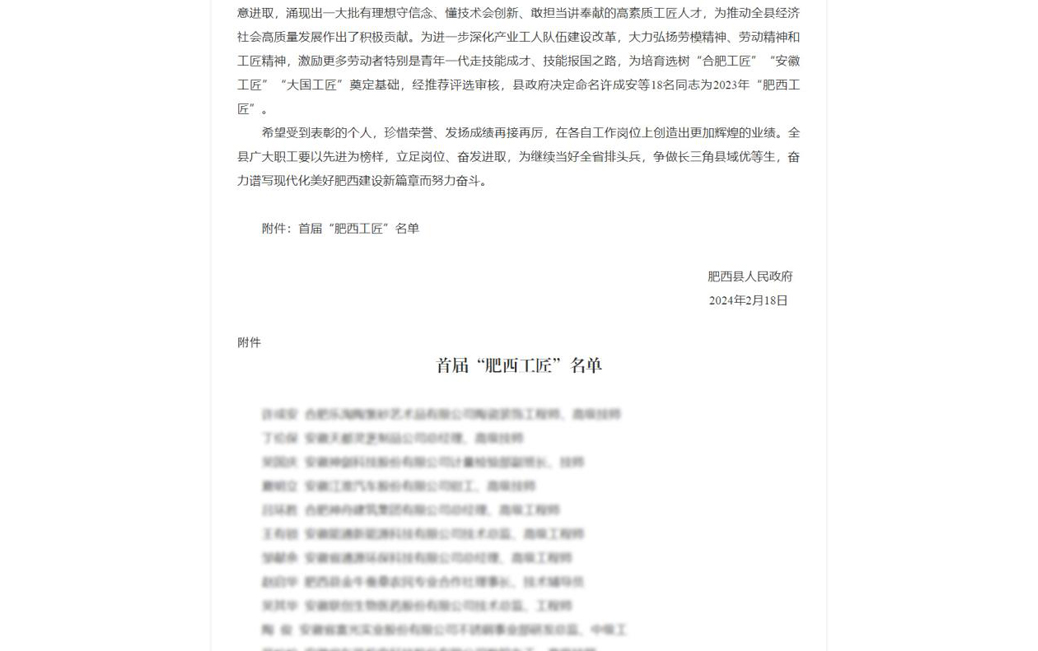 近日,肥西縣人民政府發(fā)布《關于命名2023年首屆“肥西工匠”的通報》。安徽信遠包裝科技有限公司項目中心總監(jiān)、電氣工程部總監(jiān)王聲根同志被命名為首屆“肥西工匠”稱號。