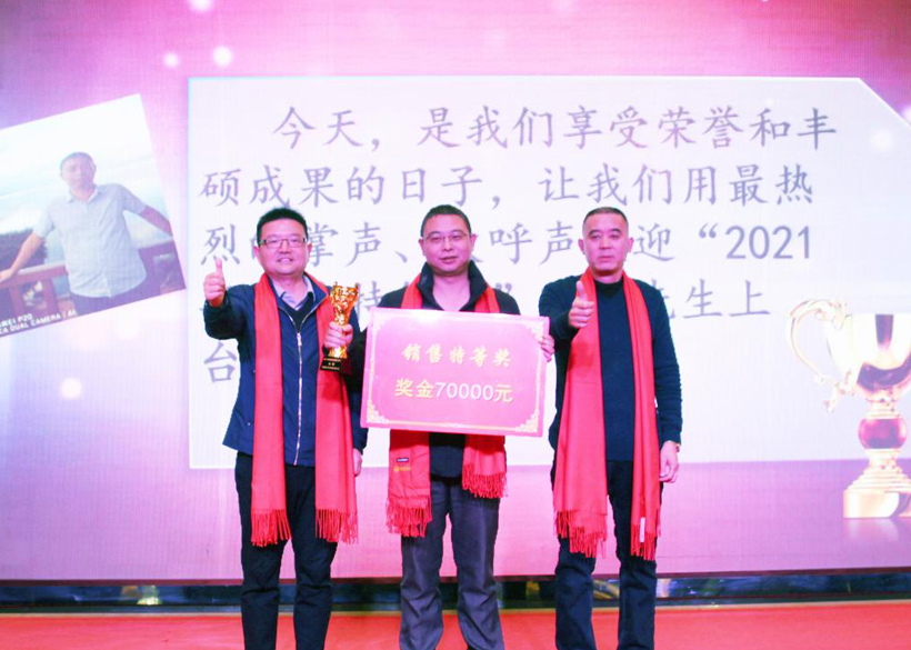 信遠(yuǎn)科技董事長(左一)和營銷中心總經(jīng)理(右一)為田偉頒獎