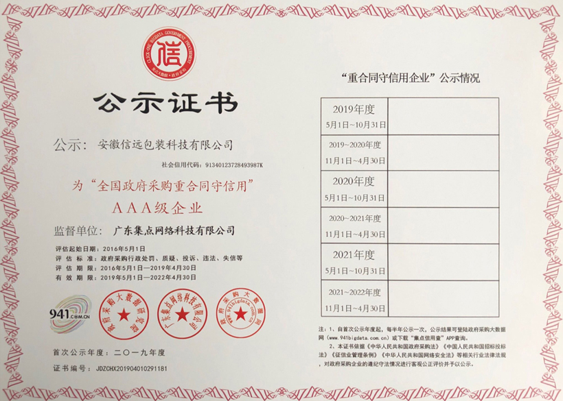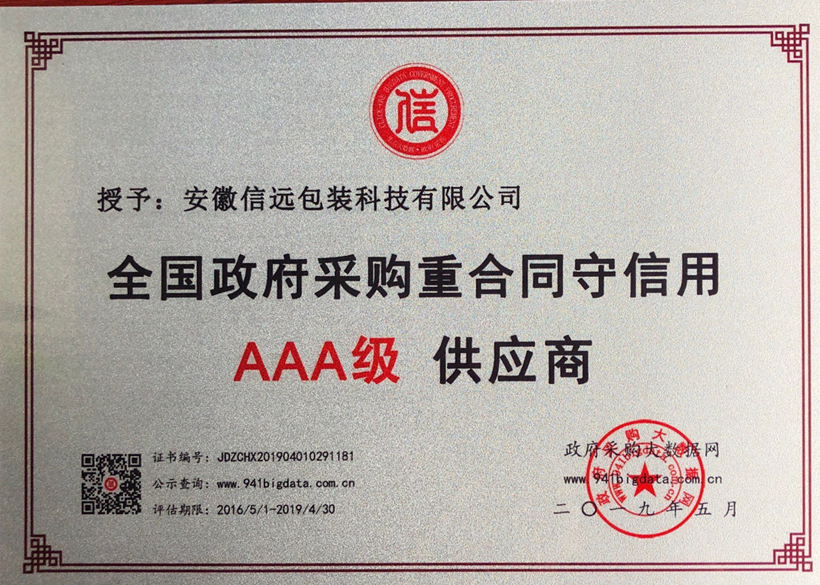 政府采購(gòu)大數(shù)據(jù)研究院根據(jù)全國(guó)政府采購(gòu)誠(chéng)信記錄,對(duì)法理依據(jù)、地方執(zhí)法裁量權(quán)等多個(gè)方面進(jìn)行科學(xué)的整理歸納后,將全國(guó)政府采購(gòu)信用行為歸納為為22個(gè)類別。通過(guò)對(duì)供應(yīng)商安徽信遠(yuǎn)包裝科技有限公司14種行為信用數(shù)據(jù)進(jìn)行綜合評(píng)估,授予信遠(yuǎn)科技為“全國(guó)政府采購(gòu)重合同守信用AAA級(jí)榮譽(yù)”.