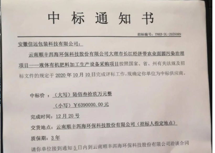 2020年10月13日我公司成功中標(biāo)“云南順豐洱海環(huán)??萍脊煞萦邢薰敬罄硎虚L(zhǎng)江經(jīng)濟(jì)帶農(nóng)業(yè)面源污染治理項(xiàng)目——液體有機(jī)肥料加工生產(chǎn)設(shè)備采購(gòu)項(xiàng)目”,中標(biāo)金額:639萬(wàn)元。