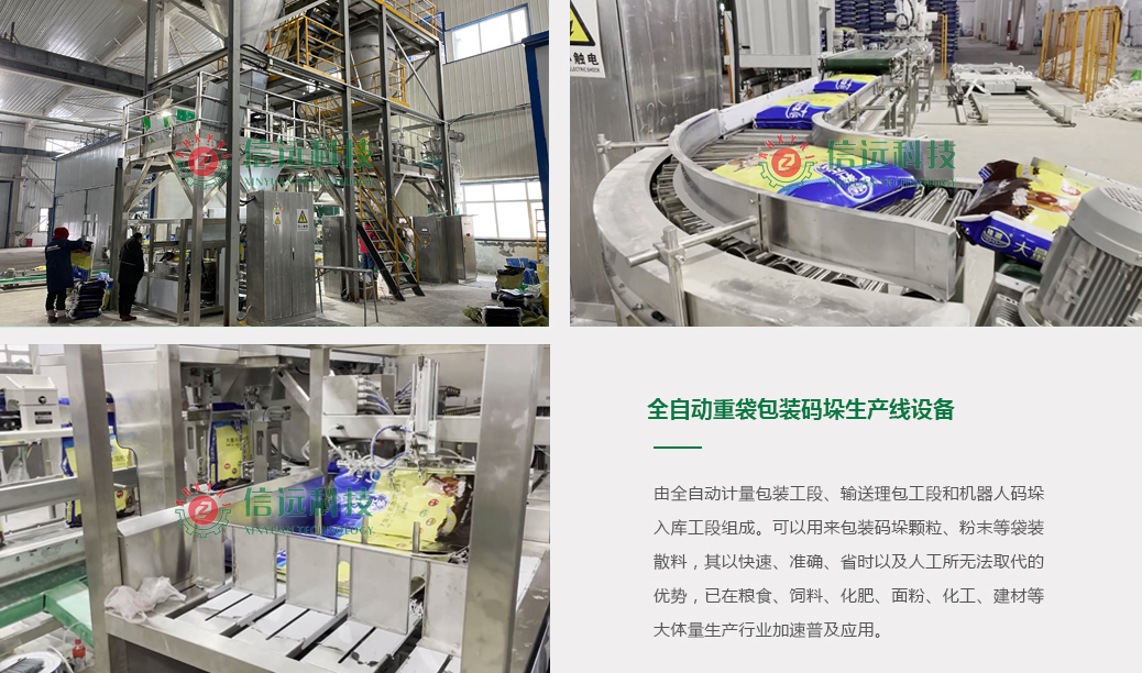全自動(dòng)重袋/大袋包裝碼垛生產(chǎn)線設(shè)備是由全自動(dòng)計(jì)量包裝工段、輸送理包工段和機(jī)器人碼垛入庫(kù)工段組成。可以用來包裝碼垛顆粒、粉末等袋裝散料,其以快速、準(zhǔn)確、省時(shí)以及人工所無法取代的優(yōu)勢(shì),已在糧食、飼料、化肥、面粉、化工、建材等大體量生產(chǎn)行業(yè)加速普及應(yīng)用。