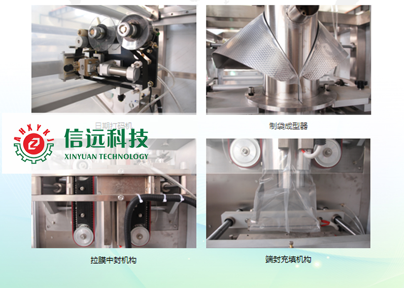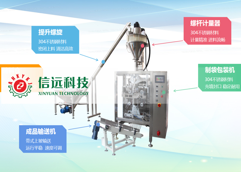 信遠科技粉劑全自動立式制袋包裝機組,是由密閉螺旋提升機、螺旋計量機、立式制袋包裝機和成品輸送機組成,可以包裝單袋克重在30-5000g范圍之間的粉狀物料,生產(chǎn)企業(yè)可以根據(jù)自己的需求選擇不同的包裝機型號。這套機組設(shè)備適合粉料和較大粉塵的超細粉狀物料的定量包裝,具有自動完成送料、計量、制袋、充填、封口、切包、打印、計數(shù)、輸送等一系列功能,是食品、化工、醫(yī)藥等行業(yè)提高包裝生產(chǎn)效率,打造無塵環(huán)保車間,提升包裝檔次的必選設(shè)備。