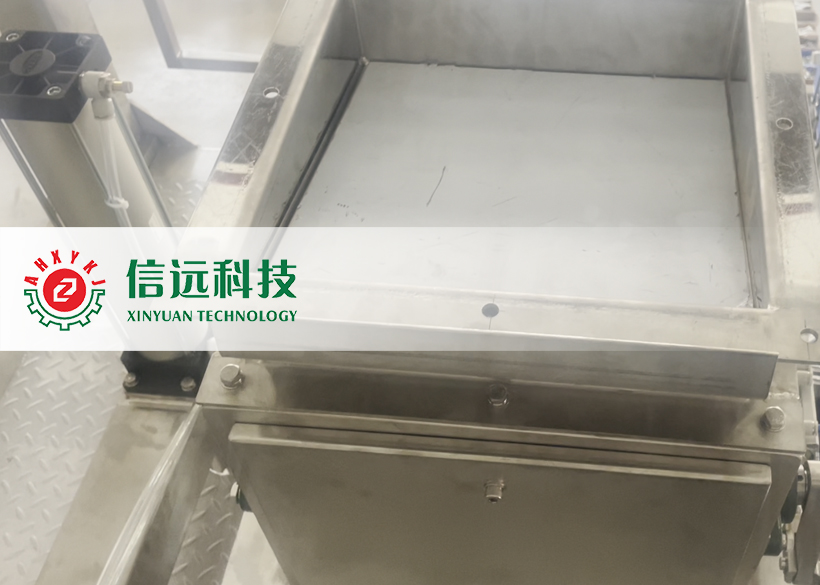 該工段采用升降式結(jié)構(gòu)設(shè)計(jì)。在物料充填前,人工在下料口套袋,并把包裝袋吊帶掛在四個(gè)掛耳上,按下啟動(dòng)按鈕,下料口夾袋氣缸開(kāi)始工作并夾住袋口,升降氣缸將包裝袋提升,風(fēng)機(jī)吹氣脹袋,控制系統(tǒng)通過(guò)參數(shù)設(shè)定將袋皮重量自動(dòng)去除,驅(qū)動(dòng)喂料機(jī)構(gòu)運(yùn)轉(zhuǎn),物料自動(dòng)下落,下料過(guò)程中,自動(dòng)排氣除塵,同時(shí)可以開(kāi)啟自動(dòng)敦袋功能(敦袋次數(shù)可任意設(shè)定),達(dá)到設(shè)定重量停止下料,包裝袋自動(dòng)降落到下面的輸送機(jī)上,夾袋氣缸松開(kāi)袋口,吊帶自動(dòng)脫鉤,輸送機(jī)自動(dòng)啟動(dòng)把包裝袋運(yùn)送至下一工序。