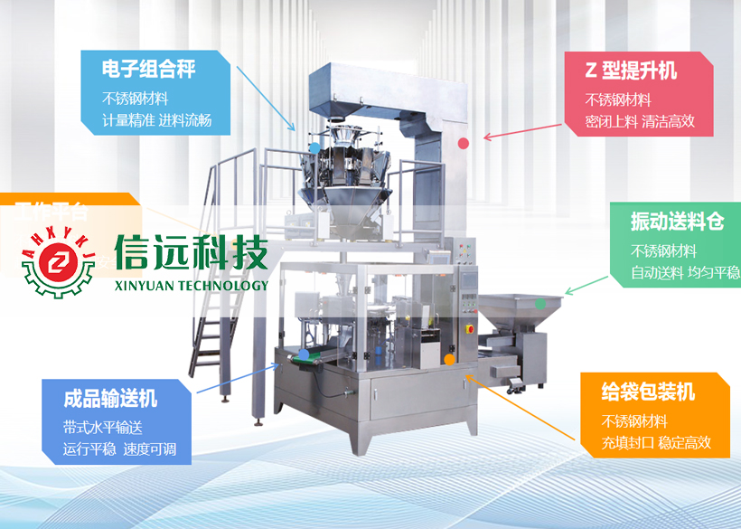 信遠(yuǎn)科技顆粒料全自動(dòng)旋轉(zhuǎn)式給袋包裝機(jī)組,是由密閉Z型提升機(jī)、電子計(jì)量組合秤、多工位旋轉(zhuǎn)式給袋包裝機(jī)和成品輸送機(jī)組成。可以包裝單袋克重在30-5000g范圍之間的顆粒狀物料,生產(chǎn)企業(yè)可以根據(jù)自己的需求選擇不同的包裝機(jī)型號(hào)。這套機(jī)組設(shè)備適合各種顆粒狀、片狀、條狀、圓狀、塊狀及不規(guī)則形狀等物料的定量包裝,具有自動(dòng)完成送料、計(jì)量、給袋、充填、封口、打印、計(jì)數(shù)、輸送等一系列功能,是食品、化工、農(nóng)資等行業(yè)提高包裝生產(chǎn)效率,打造綠色環(huán)保車間,提升包裝檔次的新型自動(dòng)化裝備。