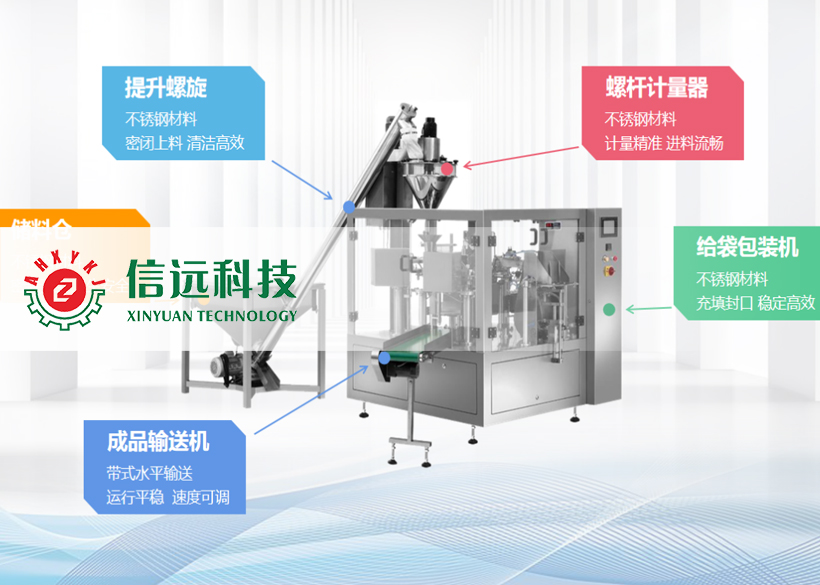 信遠科技粉劑全自動旋轉(zhuǎn)式給袋包裝機組,是由密閉螺旋提升機、螺旋計量機、多工位旋轉(zhuǎn)式給袋包裝機和成品輸送機組成??梢园b單袋克重在30-5000g范圍之間的粉狀物料,生產(chǎn)企業(yè)可以根據(jù)自己的需求選擇不同的包裝機型號。這套機組設(shè)備適合無粘性粉料的定量包裝,具有自動完成送料、計量、給袋、充填、封口、打印、計數(shù)、輸送等一系列功能,是食品、化工、醫(yī)藥等行業(yè)提高包裝生產(chǎn)效率,打造無塵環(huán)保車間,提升包裝檔次的新型自動化裝備。
