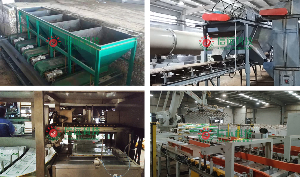 該套方案中的有機(jī)原料在一定周期內(nèi)通過翻堆通風(fēng)的方式完成發(fā)酵過程,腐熟后的原料經(jīng)過粉碎系統(tǒng)擠壓脫水進(jìn)入配料和攪拌系統(tǒng),混合均勻的原料卸料至高速回轉(zhuǎn)的造粒系統(tǒng)完成球化成粒,成粒原料需要經(jīng)過烘干、冷卻和篩分過濾,篩分環(huán)節(jié)可以設(shè)置一級篩分、二級篩分,使成品率更高,顆粒度更好的有機(jī)原料進(jìn)入包膜環(huán)節(jié)進(jìn)行粒度定型鞏固,然后進(jìn)入成品包裝環(huán)節(jié)。包裝工段可以實(shí)現(xiàn)自動取袋、上袋、套袋、夾袋、計(jì)量、充填,當(dāng)袋內(nèi)物料達(dá)到設(shè)定重量后,自動停止充填、自動松袋落袋、抱袋裝置自動推送至縫包機(jī)前,完成包裝袋封口。成品袋在輸送過程中,自動完成倒包、振實(shí)、壓平等理包整形作業(yè),機(jī)器人進(jìn)行碼垛(雙包型抓手),叉車搬運(yùn)入庫。