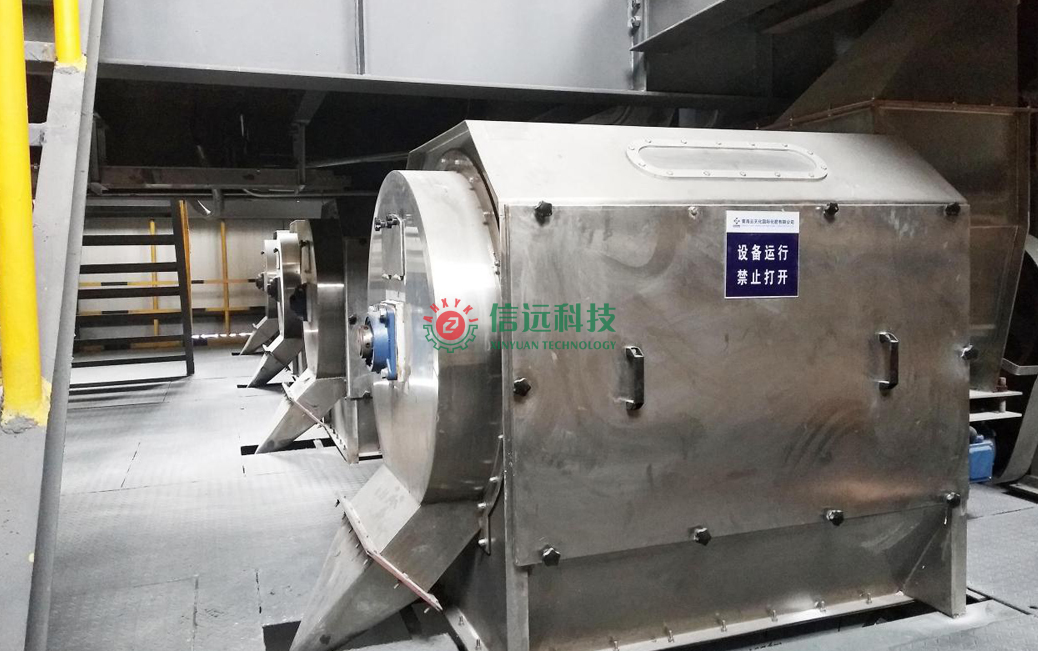 先介紹第一款篩分機(jī),也稱為除雜篩分機(jī),以清理原料中的雜物為主,采用臥式滾筒結(jié)構(gòu)設(shè)計,適用于大噸位生產(chǎn)線原料的快速過濾除雜。該機(jī)可以把混雜在原料中的線頭、塑料、紙片、結(jié)團(tuán)等大雜,有效清理分離,使原料達(dá)到工藝要求。這款設(shè)備的工作原理是:當(dāng)螺旋喂料器將需要篩理的物料喂入篩筒后,在轉(zhuǎn)子打板的旋轉(zhuǎn)推動下,結(jié)團(tuán)物料被打碎,同時在離心力的作用下,小于篩孔的原料迅速穿過篩孔,從底部原料出料口排出機(jī)外,大于篩孔尺寸的大雜則在傾斜打板的作用下向大雜出料口方向推移,最后排出機(jī)外,完成整個除雜篩分過程。