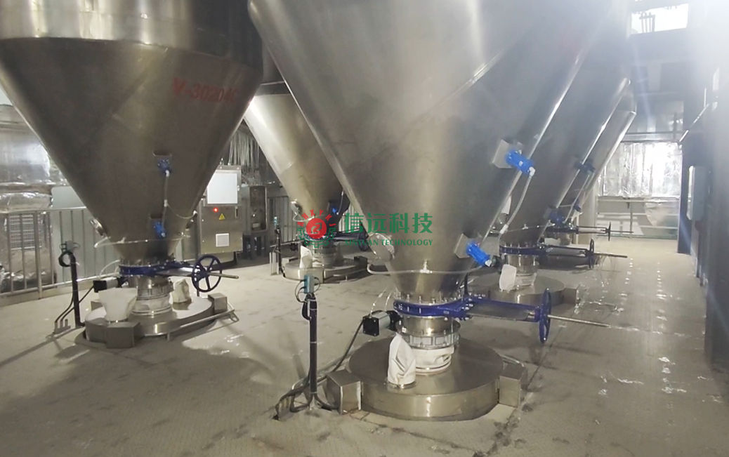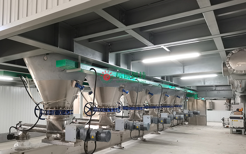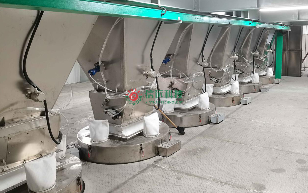 我們先從過(guò)渡料倉(cāng)講起,過(guò)渡料倉(cāng)位于預(yù)處理設(shè)備和配料倉(cāng)之間,是一種錐形結(jié)構(gòu)容器,主要是緩存預(yù)處理后的原料,為進(jìn)入下方的配料倉(cāng)作過(guò)渡緩沖準(zhǔn)備。當(dāng)下方配料倉(cāng)內(nèi)的原料小于設(shè)定重量值時(shí),系統(tǒng)會(huì)自動(dòng)傳送信號(hào)給過(guò)渡料倉(cāng),此時(shí)倉(cāng)門自動(dòng)開啟卸料。為防止原料在腔體內(nèi)架橋,倉(cāng)體配有振動(dòng)、破拱裝置。如果您要問(wèn)一套生產(chǎn)線,需要配置多少個(gè)過(guò)渡料倉(cāng),原則上是一種原料對(duì)應(yīng)配置一個(gè)過(guò)渡料倉(cāng)。