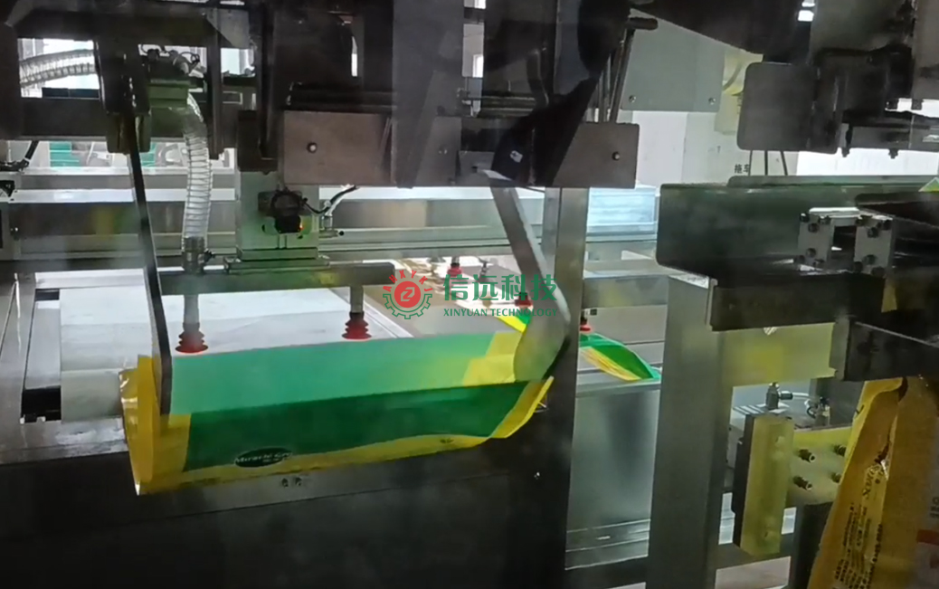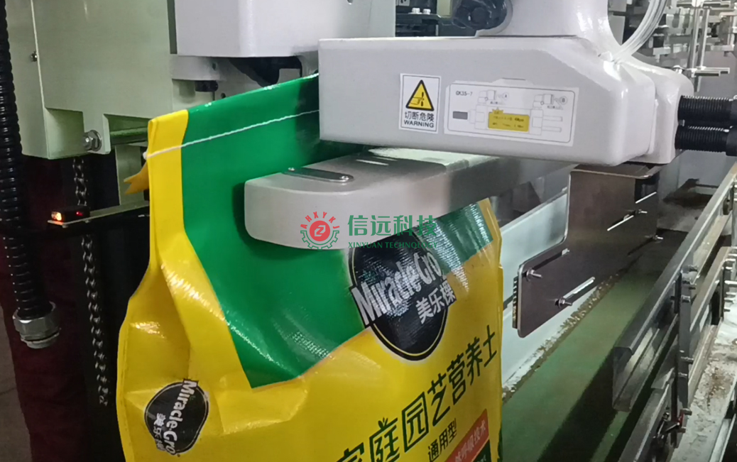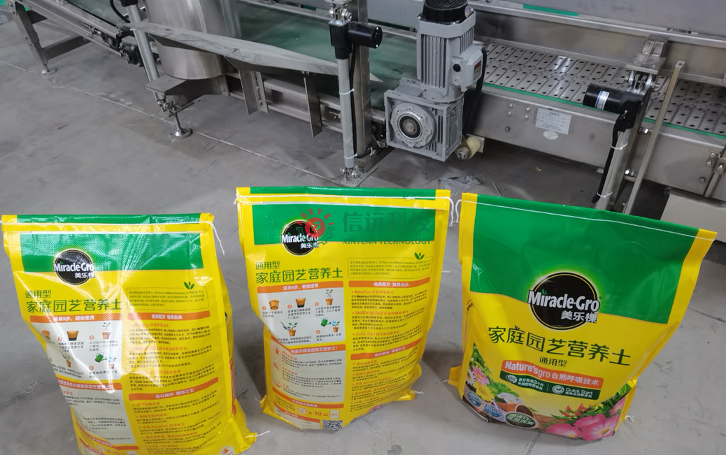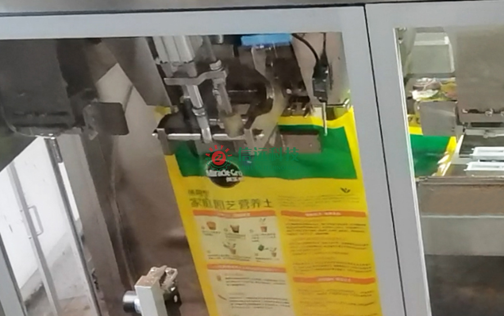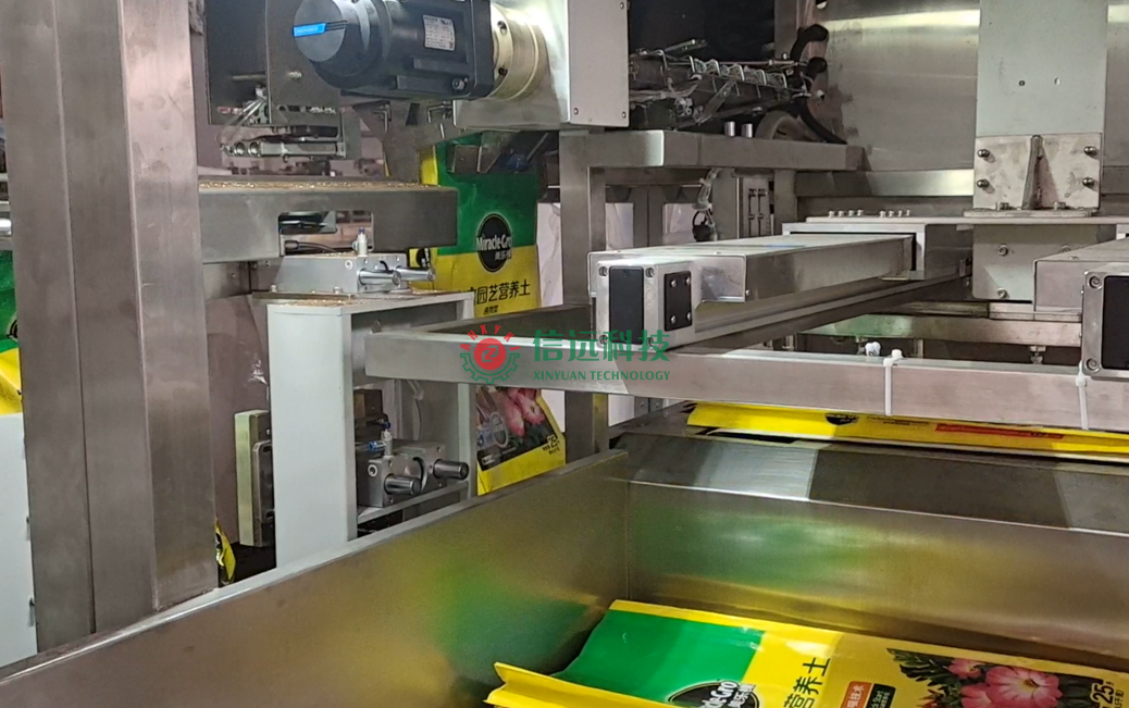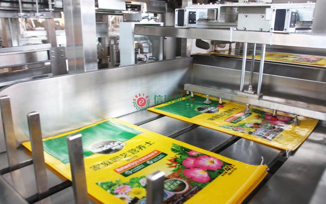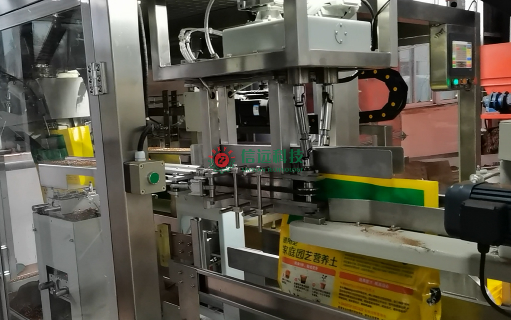 安徽信遠(yuǎn)包裝科技有限公司作為國內(nèi)知名的農(nóng)資農(nóng)化設(shè)備專業(yè)制造商,按約為該品牌營(yíng)養(yǎng)土生產(chǎn)商提供了成套的自動(dòng)化包裝機(jī)設(shè)備,該設(shè)備是一套給袋式重袋包裝系統(tǒng)。生產(chǎn)流程是配方原料通過計(jì)量料倉喂料至重袋包裝機(jī),在前端上袋機(jī)的配合下,自動(dòng)完成取袋、上袋、套袋、夾袋、計(jì)量、充填、抱袋、振實(shí)等作業(yè);包裝機(jī)后端與縫包機(jī)相聯(lián),在導(dǎo)袋機(jī)構(gòu)和皮帶輸送機(jī)的配合下,自動(dòng)完成移栽、導(dǎo)袋、折邊、縫合、剪線等工序,完成成品輸出。