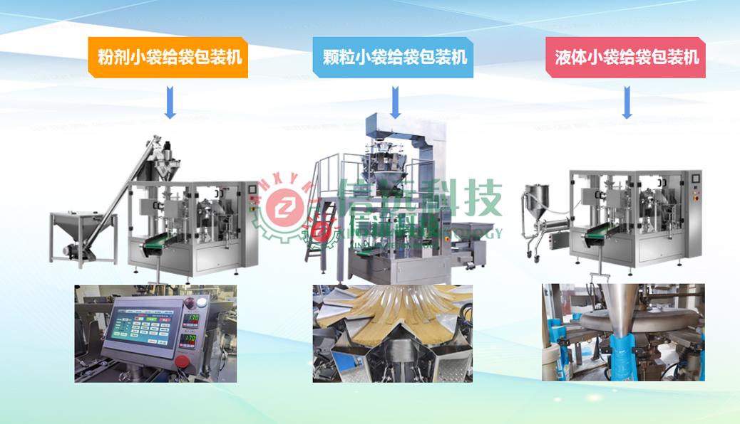 信遠(yuǎn)科技全自動給袋包裝機組,整機結(jié)構(gòu)同樣采用不銹鋼材質(zhì)制造。該機具有自動完成送料、計量、給袋、充填、封口、打印、計數(shù)、輸送等一系列功能,可以生產(chǎn)粉料、顆粒料、液體料。旋轉(zhuǎn)式的多工位給袋包裝機采用高精度伺服系統(tǒng)帶動主軸運轉(zhuǎn),袋寬大小可以一鍵調(diào)節(jié),多組機夾跟隨袋寬同步調(diào)節(jié),包裝過程通過變頻調(diào)速裝置,輕松實現(xiàn)穩(wěn)定運行。